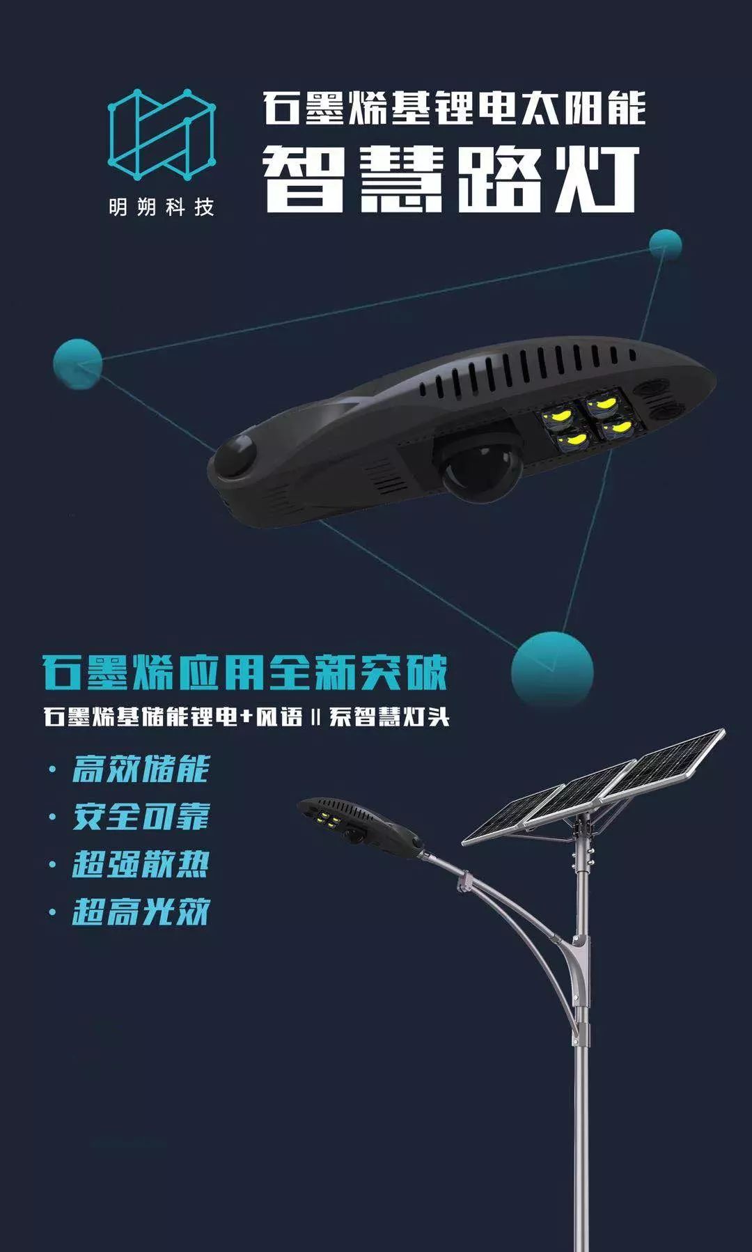 石墨烯基鋰電太陽能智慧路燈與明朗-石墨烯基鋰電太陽能路燈均采用明朔科技與朗越能源共同開發的具有超大容量、超寬使用溫度范圍的“石墨烯基儲能鋰電系統”,該系統是繼2018年11月明朔科技、朗越能源成功簽署《戰略合作協議》后的半年間,經過研發測試和充分論證的開創性成果。